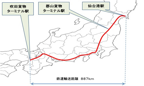この取り組みは4社が連携することで実現したもので、大阪・仙台間を毎日1往復運行し、大型トラック60台分を段階的に貨物鉄道へ転換する。このモーダルシフトによるCO2の排出削減量は年間1万3810トンを見込む。