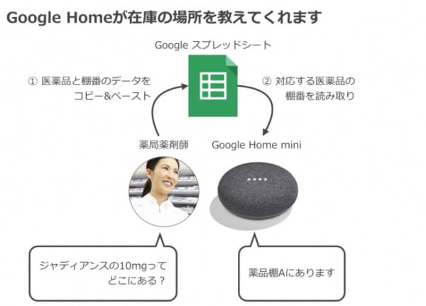 「Google Home」(グーグル・ホーム)などのGoogleアシスタント対応スマートスピーカーに「(医薬品名)はどこにある?」といった問いかけに音声で回答してくれるという。