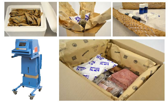 ランパックの紙緩衝材をコールドチェーンに活用することにより、低温状態を維持するために熱伝導率の低い素材である紙の緩衝材で梱包物内の隙間を埋め、梱包物内の空気循環を少なくすることで、保冷効果を持続することができる。