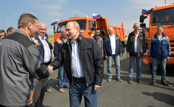 ジーンズ姿で現れたプーチン大統領は、工事関係者と短く話した後、初めて橋を渡るトラックの先頭車両の運転席に乗り込み、自らハンドルを握って「開通したクリミア大橋を渡る最初のトラックドライバー」となった。