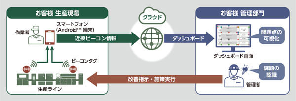 このサービスは、製造ラインや倉庫内に設置したビーコンと、作業員や台車に取りつけたスマートフォンの通信により、人の動きをモニタリングし、データとして「見える化」するもの。工程の遅延やライン停止が発生しやすい場所や人を特定し、業務の改善につなげることが可能となる。