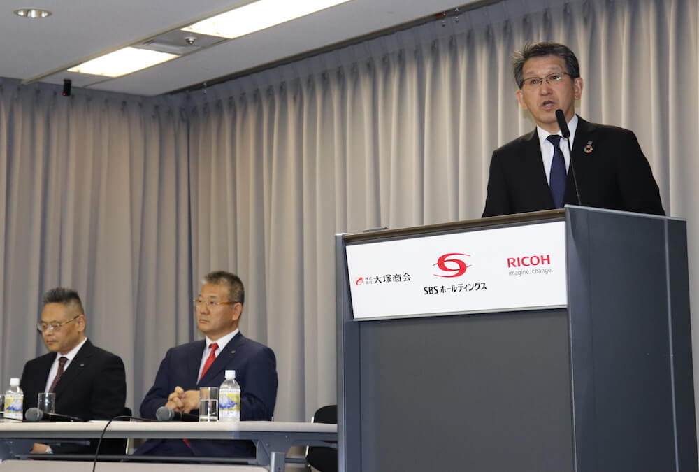 話題SBSホールディングス、リコー、リコーロジスティクスの3社の経営トップは18日、記者会見を行い、リコーがリコーロジスティクスの株式の66.6%をSBSHDへ180億円で売却すること、リコーと大塚商会で構成する共同持株会社(JV)が33.3%を保有してリコーロジへの物流委託を継続することを明らかにした。