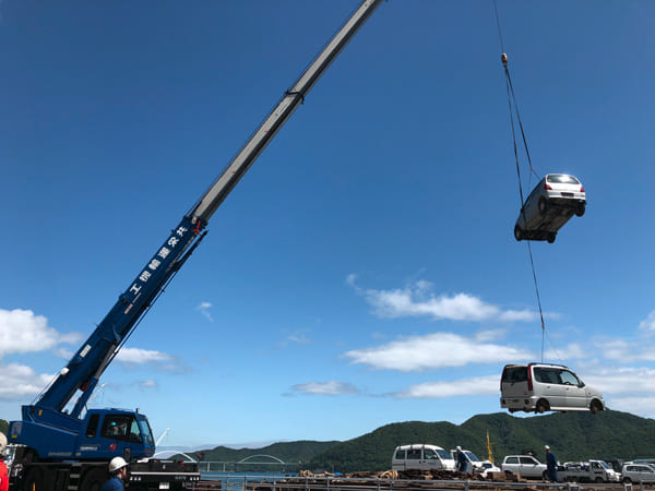 同社は、離島で発生した使用済み自動車などの海上輸送費に対して国が支援する「離島対策支援事業」を活用し、大崎上島からの使用済み自動車の海上輸送を実施した。