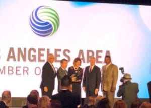 4日に行われた授賞式は、ロサンゼルス市のエリック・ガルセッティ市長をはじめ、1500人の同地区商工会議所会員が出席した。壇上では鴻池運輸の紹介映像の放映後、商工会議所会頭より辻会長にクリスタル製の表彰盾が授与された。
