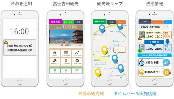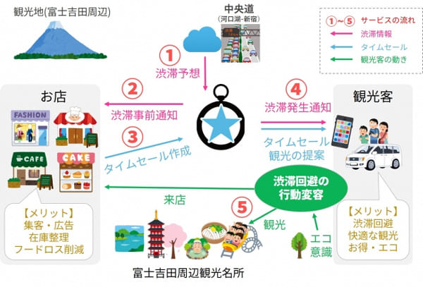 30分後の渋滞発生時には、ザ・タイムセールのアプリ利用者へ渋滞発生を連絡し、渋滞緩和までの所要時間とその時間を「楽しく過ごす」ためのタイムセール、観光情報を同時に提案、その行動変容率などを計測し、今後のサービス展開・連携へつなげていくという。