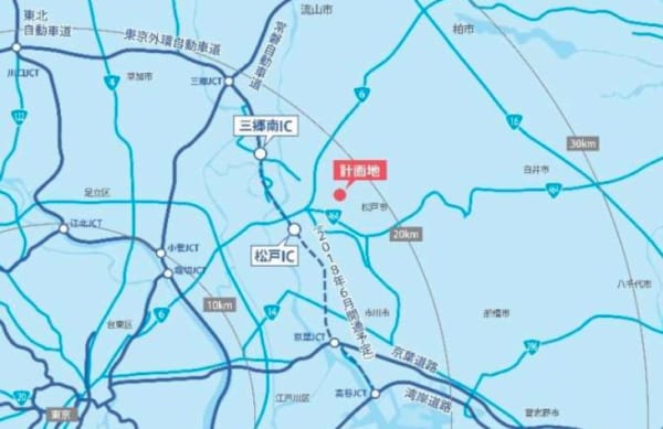 同センターは、都心部から20キロ圏内に位置し、6月に開通する外環道松戸インターチェンジ(IC)から4キロ、三郷南ICから6キロ、主要幹線道路の国道6号線へのアクセスに優れている。