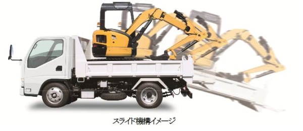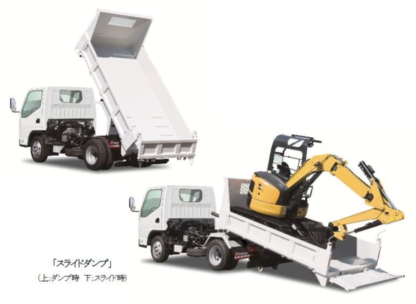 新機種は、土砂運搬・排出を行うことができるダンプ機構に加え、小型建機などを積み込み、運搬できるようにするスライド機構を備える。2つの機能を組み合わせることで、現場作業の安全性と効率アップを支援する。