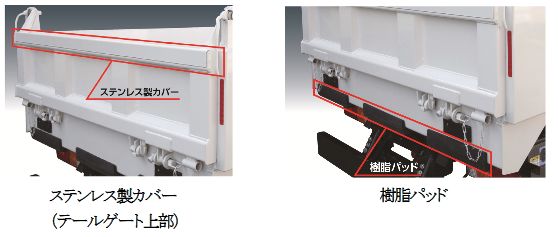 テールゲートの上部にはステンレス製のカバーを採用し、防錆性と耐久性を高めた。さらに、テールゲートと地面の接地部には路面のキズ付きを防止する樹脂パッドを装備した。