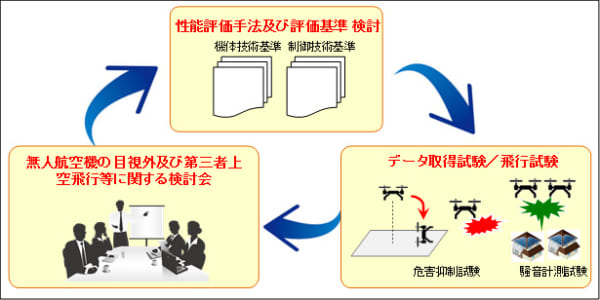 機体の信頼性向上や第三者に対する危害を抑制する方法を検討し、福島ロボットテストフィールドなどでの試験も踏まえた上で、無人航空機の信頼性・安全性を評価する手法を開発する。さらに、環境に配慮した無人航空機の騒音対策に関する性能評価基準の開発にも取り組む。