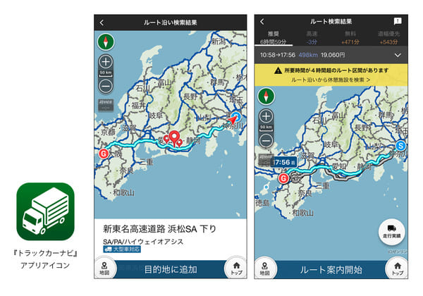 さらに、ドライバーは4時間の運転ごとに30分以上の休憩をする必要があるが、効率的に休憩時間の確保できるよう、ルート検索時に出発地、目的地、経由地の地点間を走行する所要時間が4時間を超える区間があった場合には、アプリ内でアラートで表示し、長時間運転を防止する機能も追加した。