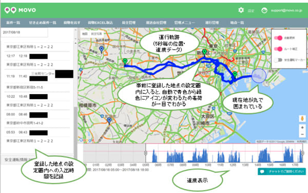 今回開発した機能のうち、配送計画機能では、運送会社が荷物を集荷・配送する地点、時間を配送計画として運行車両に紐づけ、現在位置と運行軌跡がリアルタイムに把握できるようにするほか、渋滞情報も加味して計算された到着予想時刻の表示、到着遅延が予想される場合の自動メール連絡に対応する。