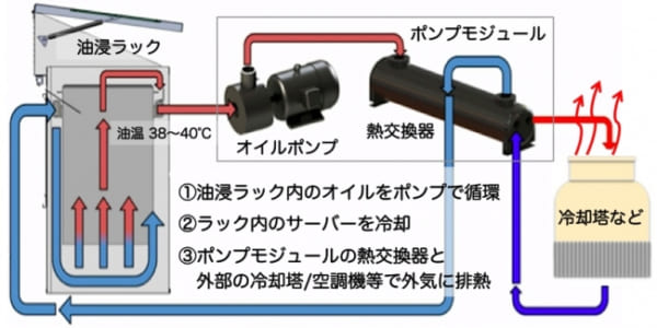 油浸冷却システムは、油浸ラックにサーバ類を浸けて冷却油で冷やすもので、冷却に必要な電力は冷却油を循環させるポンプ電力のみとなっており、従来の冷却電力を90%削減するという。
