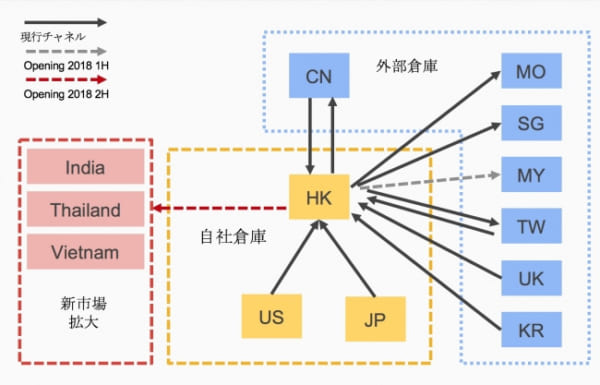 現在の拠点は香港・日本・米国・英国・中国・韓国・台湾、シンガポール・マレーシア・マカオの10か国・地域となっているが、18年下期にはインド・タイ・ベトナムで新倉庫が稼働する。