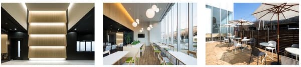 施設内のエントランス、ラウンジ、リフレッシュルーム、屋外デッキには、従業員が快適に過ごせるよう演出が施されている。エントランスには天然木のデザインウォールを採用し、ラウンジには多様な光・あかりによって表情が変わる素材を壁面に選定しており、カフェをイメージした空間は、従業員の交流の場として利用できる。