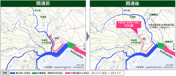 拠点・施設ナビタイムジャパン(東京都港区)は11日、東京外環自動車道三郷南インターチェンジ(IC)-高谷ジャンクション(JCT)間開通に伴う「首都圏の交通流」への影響分析結果を発表した。