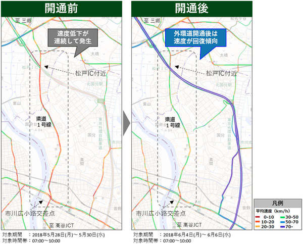 旅行速度について見てみると、開通前は県道1号線 外環道松戸IC付近から国道14号にかけて、速度低下が連続して発生している。一方開通後は、同区間の速度が回復傾向にある。