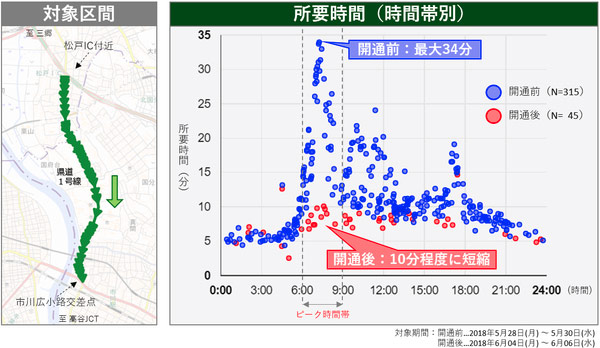 狭域分析では、千葉県道1号線外環道松戸IC付近から国道14号へ向かう同区画のピーク時の所要時間が最大20分短縮した。道1号松戸市川線を含むエリアでの平日朝(7-10ジ)の旅行速度、道路の所要時間を可視化した。