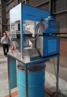 ▲水銀含有ばいじんは、機器後方の専用ボックスへ吸引。粉砕したガラスや金具などは、下部のドラム缶で回収しリサイクル