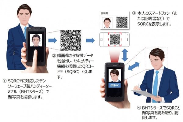 この製品では、QRコードである「SQRC」に顔の特徴データを格納し、本人確認はQRコード読み込みと顔撮影による顔照合で行う。このため、ネットワーク環境の整っていない場所でも顔認証が可能なほか、個人情報を端末内に保持しないため、セキュリティーリスクを軽減できる。