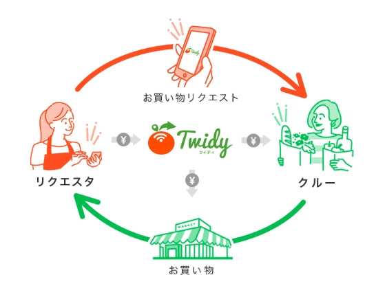 ツイディは、スーパーマーケットをはじめとする地域に根ざした小売事業者、地域の新聞販売店やデリバリー事業者、地域住民などと連携して実現する買い物代行サービス。スマートフォン、iPhoneのアプリで利用できる。