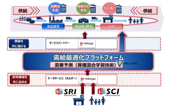 協業では、バリューチェーン全体で需給を最適化するNECのデータ流通基盤「需給最適化プラットフォーム」と、インテージの全国小売店パネル調査や全国消費者パネル調査などのさまざまなデータや分析ノウハウを組み合わせることで、同基盤の需要予測精度の向上とそれらを活用した商品需要予測サービスを展開する。