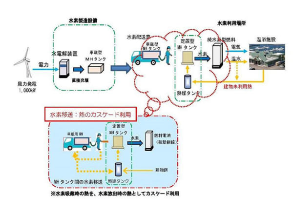 この水素移送時には「熱のカスケード利用」を行い、水素を吸収する側のタンクで発生する熱を、放出する側のタンクの加熱に利用する。また、定置型水素吸蔵合金から水素を放出するために必要な熱は、建物からの低温排熱を利用しエネルギーの効率向上を目指す。