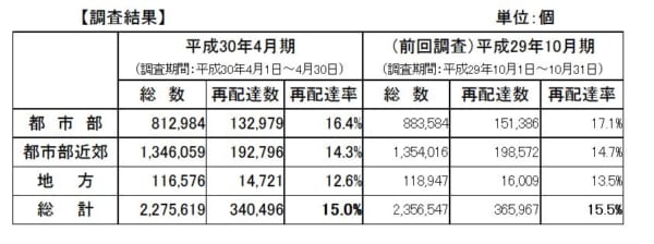 地域別にみると都市部の総数が81万2984個だったのに対し、再配達は13万2979個(再配達率16.4%)で、前年に比べ再配達率が0.7ポイント減少した。都市部近郊では総数が134万6059個、再配達が19万2796個(14.3%)で0.4ポイント減。地方では総数11万6576個、再配達が1万4721個(12.6%)で0.9ポイント減となった。