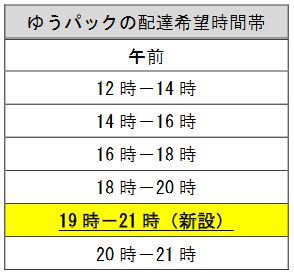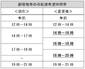 ゆうパックは帰宅時間に合わせて受け取れるよう、6区分となっている現在の配達希望時間帯に「19-21時」を追加した7区分に再編。この変更に合わせて、郵便物の再配達希望時間帯も変更する。また、当日の再配達受付の締切時刻についてもインターネット・IVR(自動音声応答システム)・コールセンターで受け付ける場合は当日7時、13時、17時までの3段階に設定し、ドライバーコールは当日19時まで受け付ける。