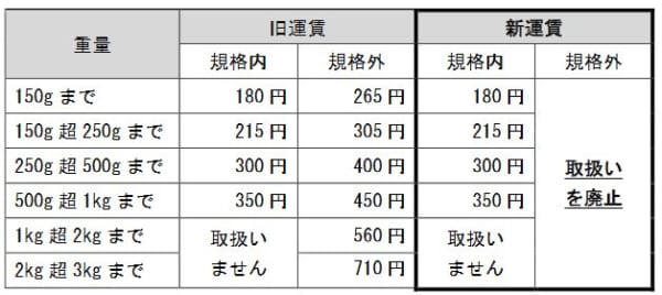 ゆうメールは規格外サイズ(長辺34センチ、短辺25センチ、厚さ3センチを超える大きさと重量1キロを超えるもの)の取り扱いを廃止し、基本運賃を一本化する。