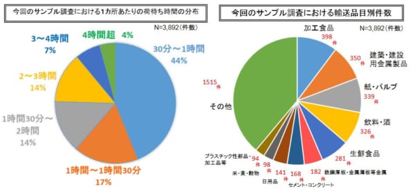 荷待ち時間の記録が義務化された昨年7月以降に「荷主の都合」で発生した30分以上の荷待ちを対象とした調査で、加工食品物流は3892件の回答のうち392件と最も多かった。