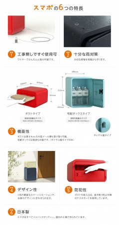 設置はワイヤーで容易に取り付けが可能で、防滴仕様により屋外設置にも対応する。ポストは厚さ4センチの大型メール便の受け取りが可能となっている。さらに、スマポ全種類対応の「あんしんサポート」で、破損や紛失などの被害を補償する。