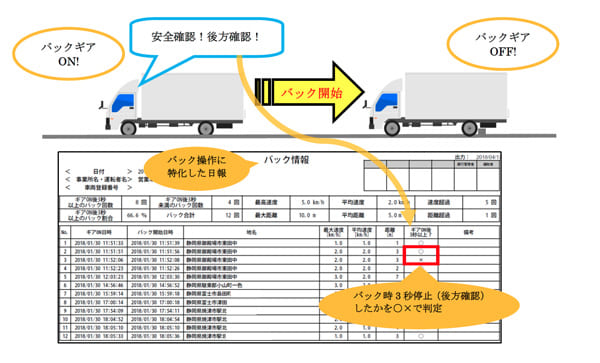 バック診断では、バックギアON、OFFをトリガーとしてバック操作に関する走行データを記録するほか、バック時の時刻、場所、平均速度、最高速度、距離を記録、バックギアON時に3秒以上停止(後方確認)したかを「○×」で判定する。