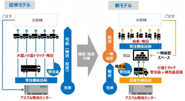 アスクルでは、新たな小口配送モデルの実証実験により、館内物流を導入済みのオフィスビルや域内物流の基盤が整備されている地区などで一時保管スペースを確保し、輸配送の負担を軽減しながら顧客への納品サービスのレベルを高める。