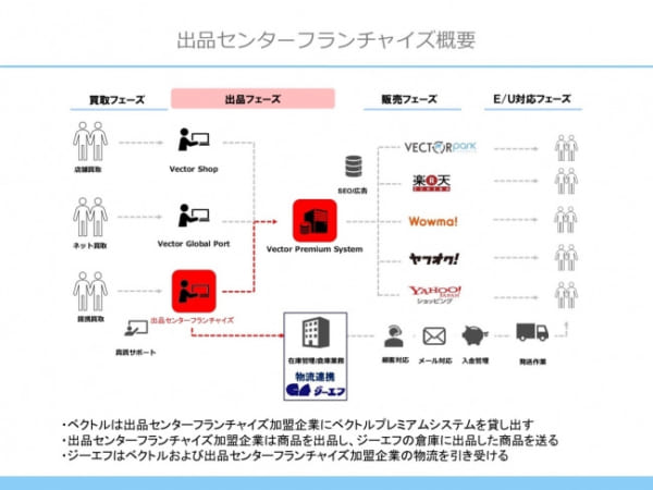 今回の取り組みでは、ベクトルが岡山市の拠点で用いているマルチチャネル出品システムを全国のジーエフ物流施設30か所と協力会社に提供し、出品センター機能を持たせることで、商品管理体制を強化する。