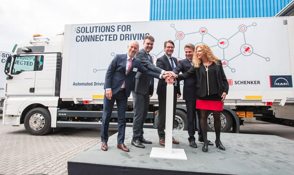 ドイツでは、DBシェンカーが独連邦政府から2.5億円の資金提供を受けてフォルクスワーゲン傘下の自動車・機械メーカー「MAN(エム・アー・エヌ)トラック&バス」や教育機関と連携し、デジタル技術で接続されたトラックの隊列走行を実施した。