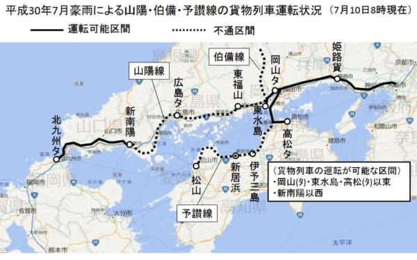 また、姫路貨物駅・岡山貨物ターミナル駅間と、東水島駅・高松貨物ターミナル駅間では10日から貨物の受付を再開したが、倉敷駅から新南陽駅間(山口県)を通過する貨物、予讃線多度津駅以西を発着する貨物、伯耆大山駅を発着する貨物は、8日15時15分からの受付停止が継続している。