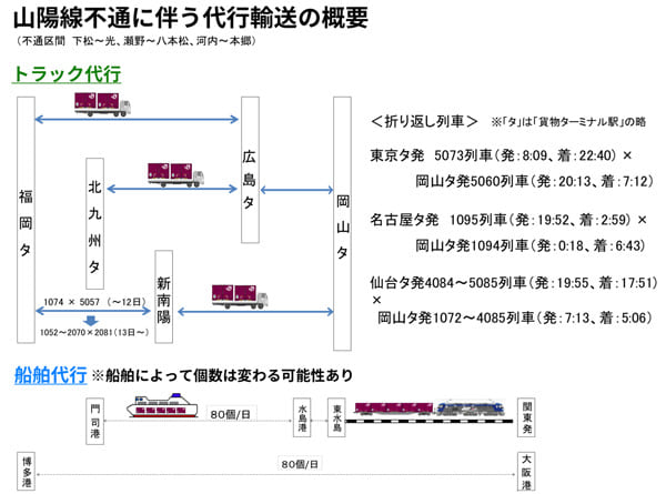 トラックによる代行輸送は、(1)岡山貨物ターミナル駅(岡山市)と広島貨物ターミナル駅(広島市)の間(2)岡山貨物ターミナル駅と新南陽駅(山口県)の間(3)広島貨物ターミナル駅(広島市)と北九州貨物ターミナル駅(北九州市)の間(4)広島貨物ターミナル駅と福岡貨物ターミナル駅(福岡市)の間――の4区間。