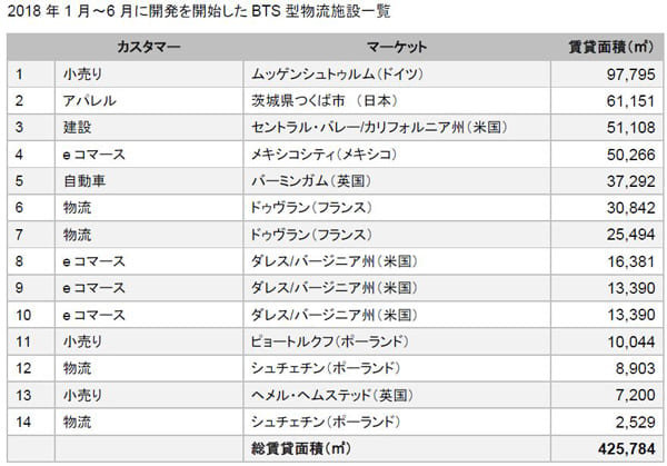 プロロジスの最高投資責任者マイケルS.カーレス氏は、「複数拠点を利用しているカスタマーの多くはeコマースに注力しており、BTSビジネスを力強くけん引し続けている。当社の開発事業が大消費地域に集中している理由は、カスタマーが最終消費者に近い施設を必要としているからだ」と述べた。