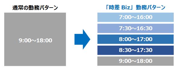 時差Bizは、通勤ラッシュ回避のために、通勤時間をずらす働き方改革のひとつで、満員電車を回避し、通勤時間の有効活用やプライベートの充実を図ることで、働きやすさと生産性向上を促進する取り組み。