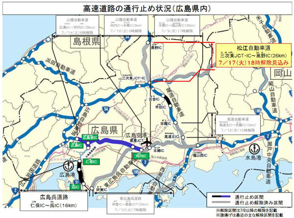 拠点・施設国土交通省は16日、西日本を中心とした豪雨により被災し、通行止めが続いている松江自動車道三次東ジャンクション(JCT)・インターチェンジ(IC)-高野IC間(26キロ)について、17日18時に通行止めを解除すると発表した。なお、高野ICのオフランプは通行止めとなっており、三次方面から高野ICで降りることはできない。
