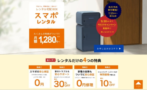 スマポは、荷物の受け取りだけでなく、発送も可能な宅配ボックス。レンタルのみの特典として、1年以内のスペアキーの無償手配や、カギ・水まわり・ガラスのサポートが特別料金で利用できるほか、家電の修理サポートなどを付帯する。月額1280円から利用できる。