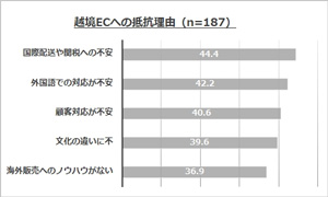 イーベイ・ジャパンが2017年11月に、海外出店意向者(309人)に越境ECへの抵抗感を聞いたところ、60.5%が「抵抗がある」と回答した。抵抗理由のうち最も多かったのが「国際配送や関税への不安」(44.4%)で、「海外進出によりビジネス拡大を図りたい意向があるものの、国際物流や外国語への対応不安などが越境ビジネスへ踏み出せない現状がうかがえる結果」となった。