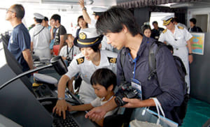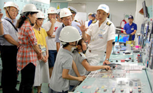 見学会には、特設サイトから応募し当選した小中学生の親子360人が参加。参加者は全長200メートル、高さ50メートルの巨大な船に乗り込み、大きなエンジンのある機関室で機器について説明を受け、実際に発電機の起動を体験。
