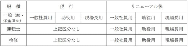 また、それぞれの系統別の制服に、一般社員用、助役用、現場長用を設ける。これまで駅などでは一般社員用、助役用、現場長用の区分があるものの運転士・検修にはなかった。リニューアル後は運転士・検修にもこれらの区分を適用する。