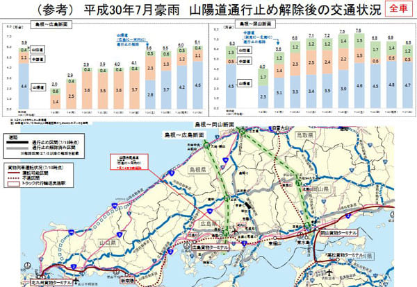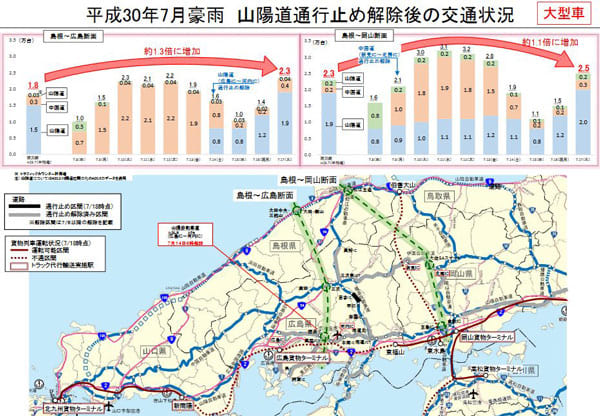 調査・データ国土交通省は18日、山陽道、中国道、山陰道の通行止め解除後の物流の状況について公表した。17日時点で3路線を利用する大型車の交通量は、被災前に比べて1-3割増加した。