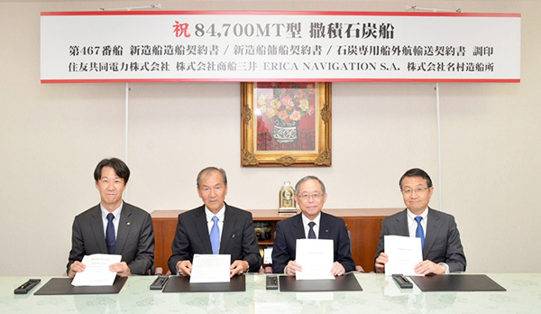 輸送契約締結と同時に、商船三井とパナマのERICA NAVIGATION社は同輸送契約に投入する新造石炭専用船の傭船契約を、ERICAと名村造船所は新造船の造船契約を締結し、名村造船所・伊万里事業所で調印式典を行った。