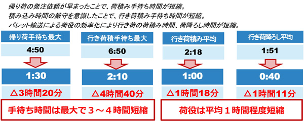 実験の結果、 帰り荷の発注依頼が早まったことで、荷積み手待ち時間が最大3時間20分、積み込み時間の厳守を意識したことで、行き荷積み手待ち時間が最大4時間40分、パレット輸送による荷役の効率化により行き荷の荷積み時間が最大1時間18分、荷降ろし時間が最大1時間11分、それぞれ短縮できた。