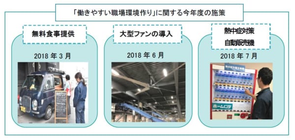 同社の熱中症対策としてはほかにも、今期導入した大型ファンをはじめ、大型クーラーや冷風機の設置などの取り組みを進めている。