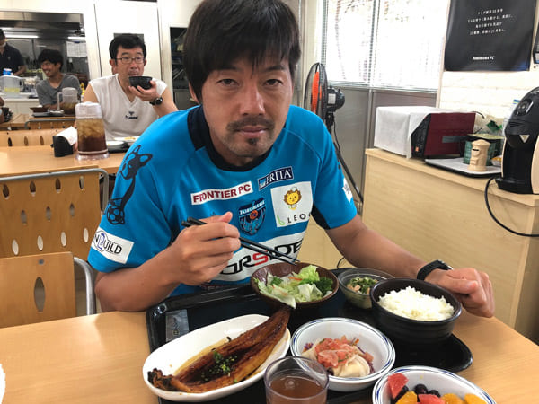 ▲横浜冷凍が差し入れたうなぎを食べる松井大輔選手(横浜FC公式ツイッターより)