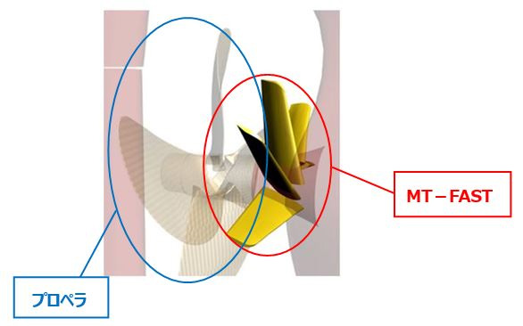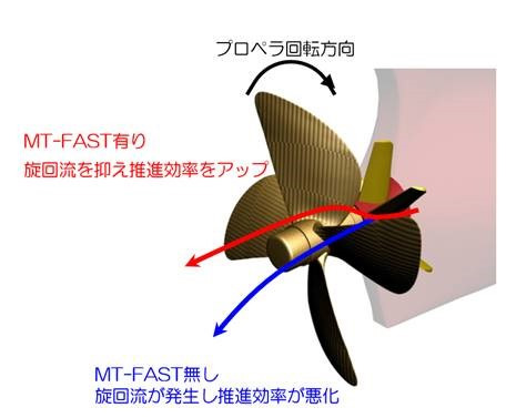 MT-FASTをプロペラ前方に取り付けることでプロペラに流入する水流を整え、プロペラ後方で発生する旋回流を低減させることができる。この結果、プロペラの推進力を向上させ4%の燃料節減を可能にする。